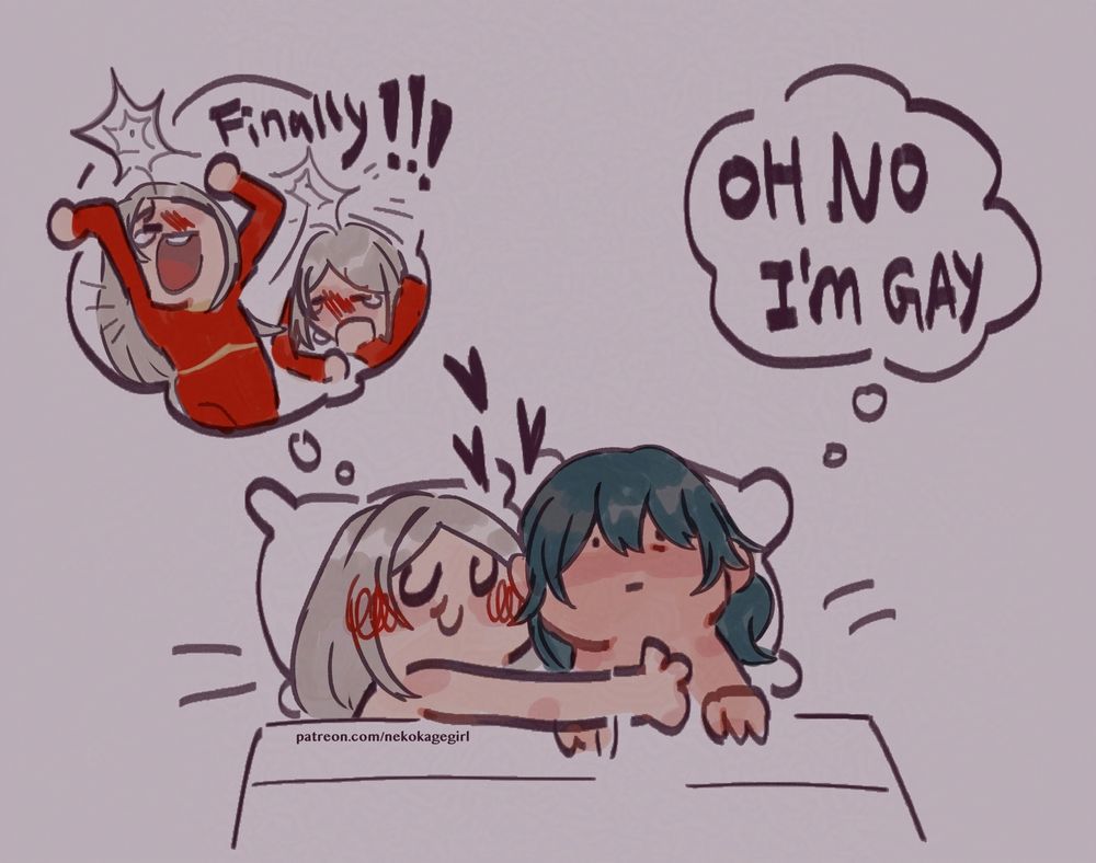 Me and @spiceeby.bsky.social did a joint comm from @spicysiren.bsky.social of our respective ships Sonya x Leanne and Edelgard x Micaiah getting together for some fun times. Had never participated in a joint commission before, was absolutely worth the wait.
