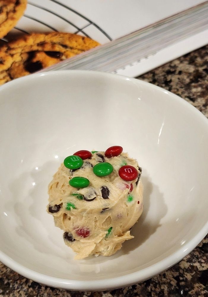 Edible Mini M&M & Chocolate Chip cookie dough. Safe to eat raw or you can bake it. I like to scoop it, freeze the scoops, then thaw, or bake, whenever I'm in the mood for a treat.