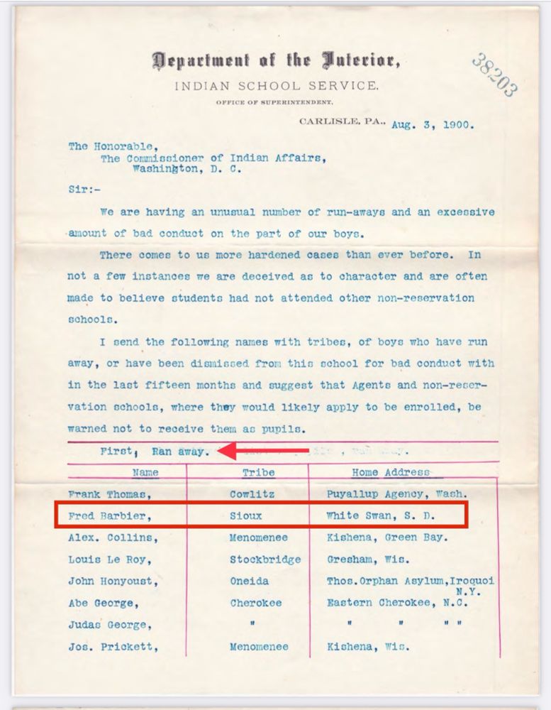 Writing an article about President Biden‘s recent designation of Carlisle Indian school as a national monument. As you can see here, my great-grandfather Fred Barber left the institution on not such great terms!