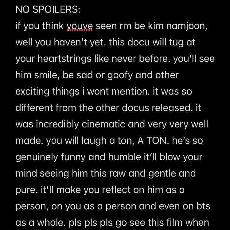 👤 Se você acha que já viu RM como Kim Namjoon, bem, ainda não viu. Este documentário tocará seu coração como nunca antes. Você o verá sorrir, ficar triste ou bobo e outras coisas interessantes que não mencionarei.
