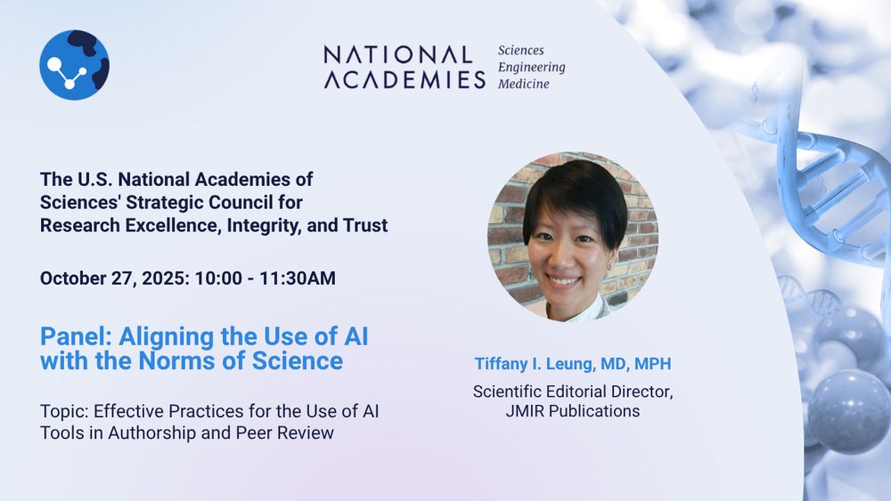 JMIR’s Scientific Editorial Director @tleungmd.bsky.social will join a panel hosted by the National Academies’ Strategic Council for Research Excellence, Integrity, & Trust on Oct 27 @ 10AM ET to discuss opportunities & risks of AI in scientific publishing ➡️ www.nationalacademies.org/event/45740_...