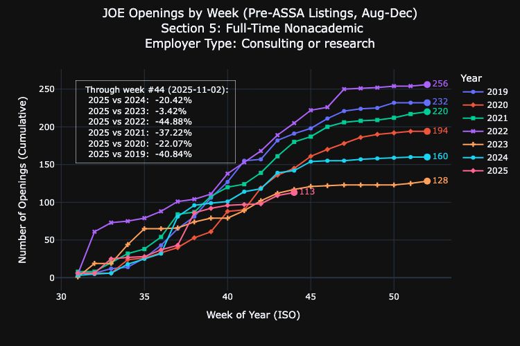 Fewer full-time non-academic job openings than during COVID, with jobs in the US Federal Govt particularly low (not surprising given DOGE and the shutdown)