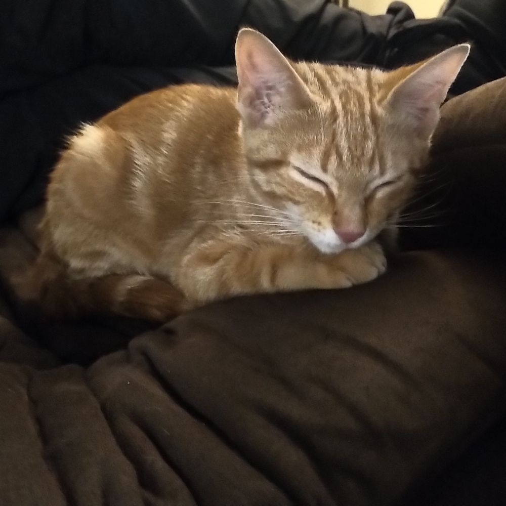 Banjo is sleeping with his head on his front paws