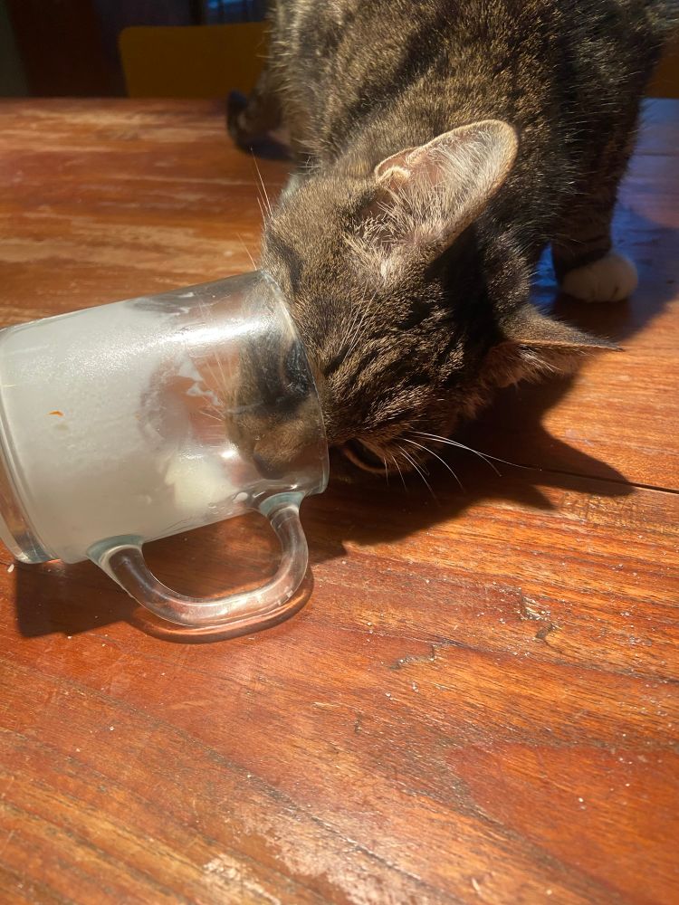 Ik ben Teuntje, ik heb vandaag al een heerlijk maaltje natvoer op, een hele bak brokjes, maar ja er stond een beker van de Kefir op de aanrecht en van de koffie. Blijkbaar paste dat niet meer in vaatwasser, dus ik heb geholpen met afwassen. Mijn personeel waardeert echt helemaal niks.