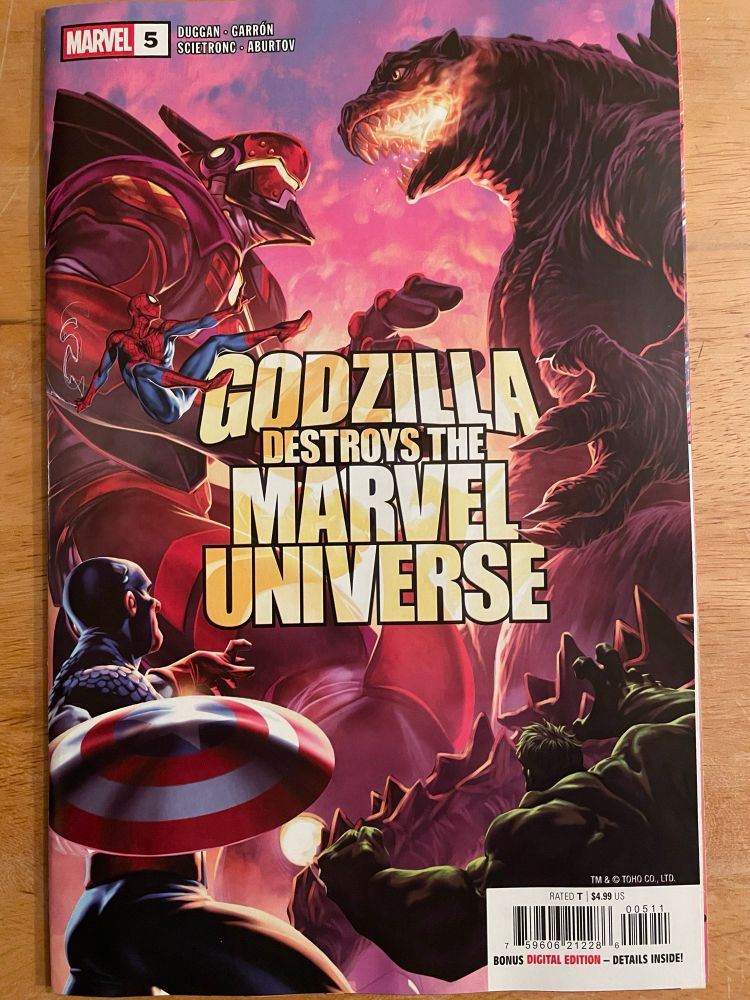 Duggan does a good job showing us the heroes working together. This issue wraps the story up well until the epilogue. Then, it just feels like an ad for another Godzilla series. The art, by Garron and Scietronic, is awesome. The page layouts are dynamic. Overall this series was very fun.