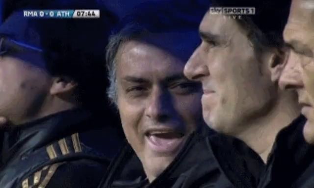Alt: Mourinho qui se moque du public de Turin en faisant signe avec sa main derrière l'oreille qu'il n'entend rien