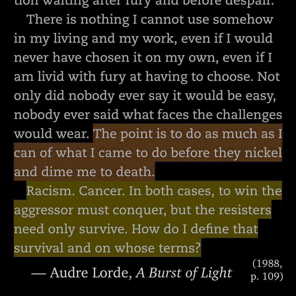 “Racism. Cancer. In both cases, to win the aggressor must conquer, but the resisters need only survive. How do I define that survival and on whose terms?”