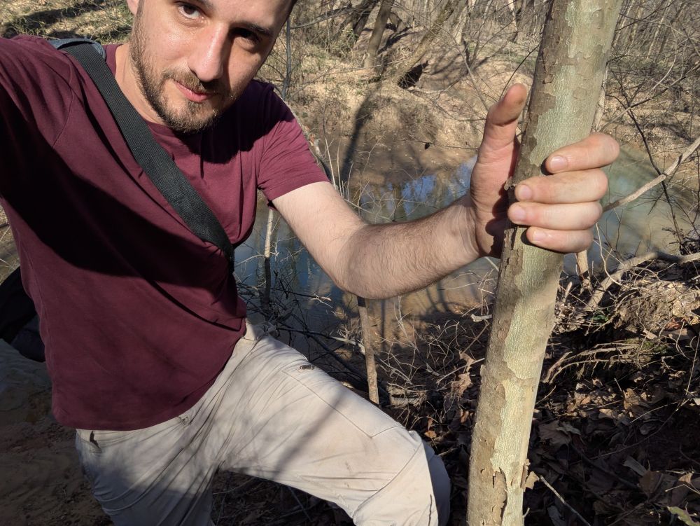Went to visit local landowners and survey areas for sites on their property. Located petroglyphs and black earth. Can't share photos of sites or artifacts but here selfie from me hanging sideways from a tree to get a photo of some erosion occurring.