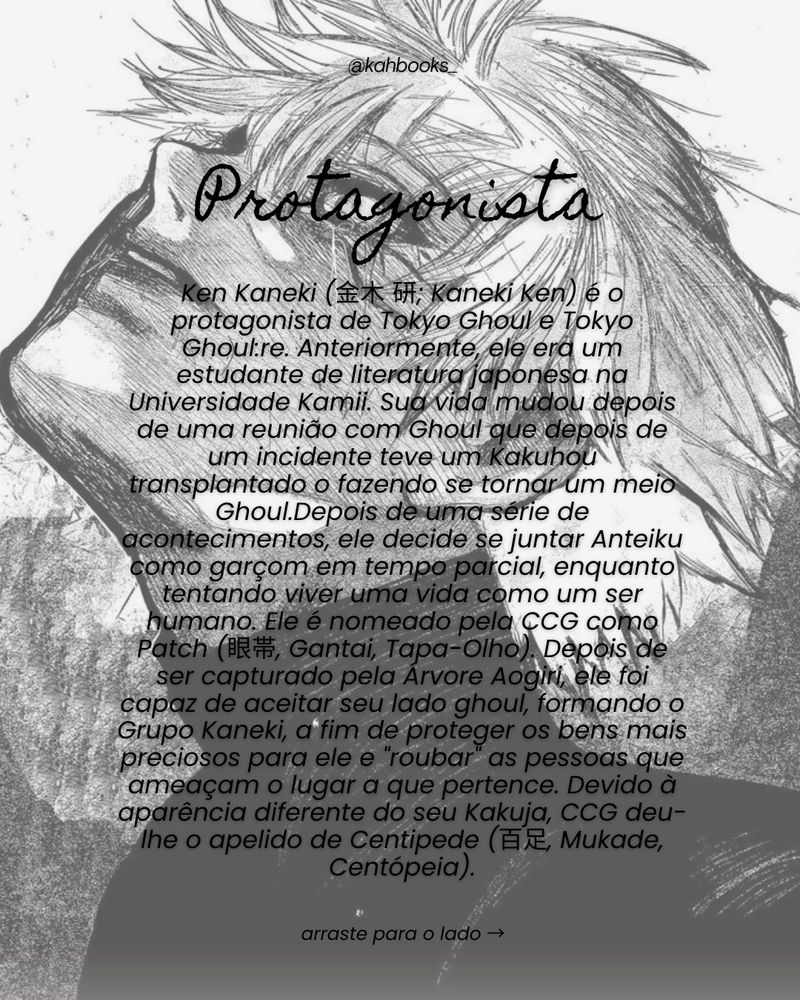 🖤 a recomendação do dia é o anime/mangá "Tokyo Ghoul"!! Perfeito para quem curte um terror psicológico, misturado com ação e ficção científica.
