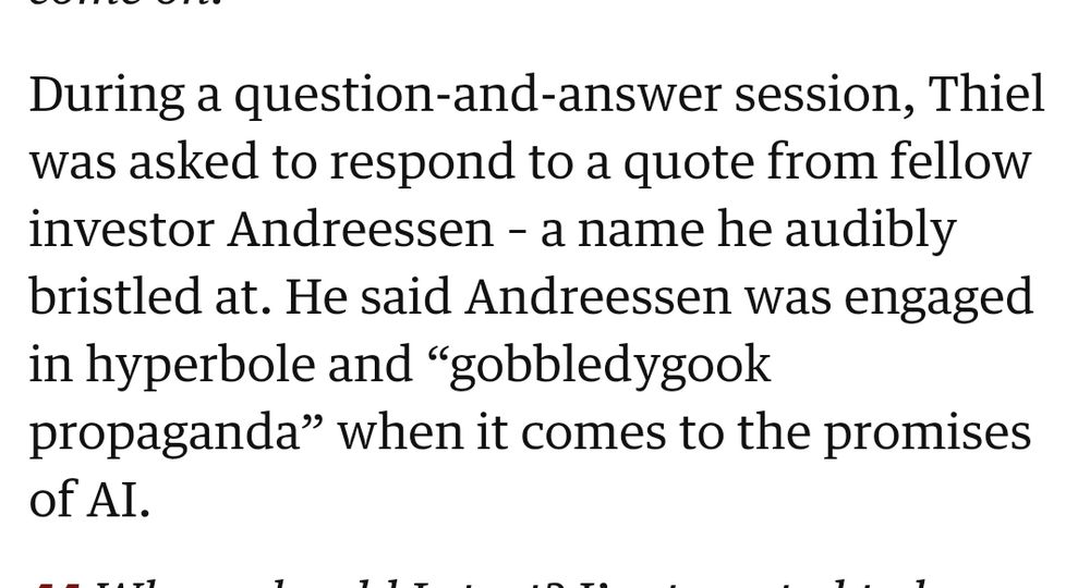 This is getting ridiculous (actually, it's already insane). As @edzitron.com has pointed out SO many times the tech can't do a zillionth of what it promises & the VC / PE money for this isn't there. Even Peter Thiel (Peter f-ingThiel, he of the antichrist lectures) knows this is bullshit hyperbole 🙄