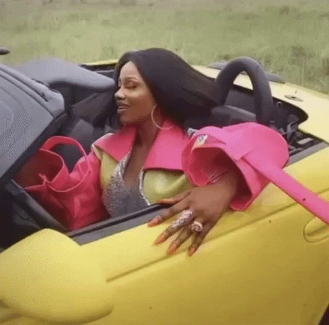 ALT: a woman in a pink jacket is sitting in a yellow car .