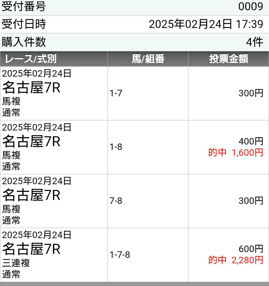 ワイドと2頭軸の3連複が的中でした。