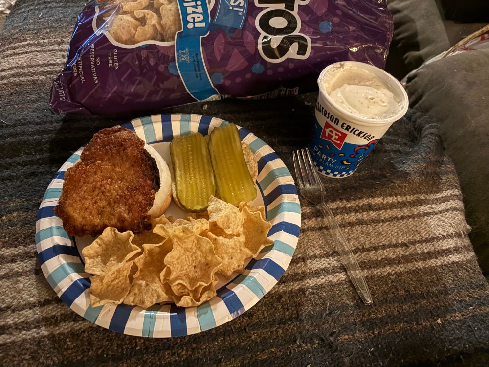 Air fryer chicken patties on a bun with mayonnaise, waffle fries. Nom nom nom.