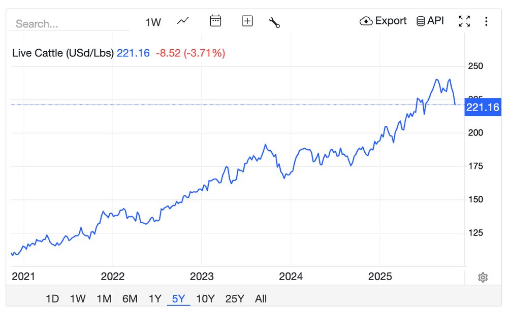 In reality cattle prices have dropped only slightly and remain near historical highs. tradingeconomics.com/commodity/li...