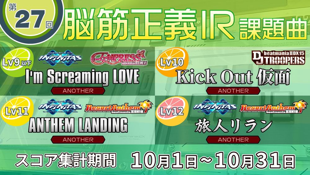 第27回脳筋正義IRについてお知らせいたします。 腕前関係無く、どなたでも参加可能なIIDX DPのスコアアタックとなっております。 皆様のご参加をお待ちしております