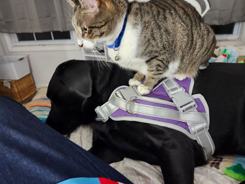 Cat sitting on dog. 🐶🐺