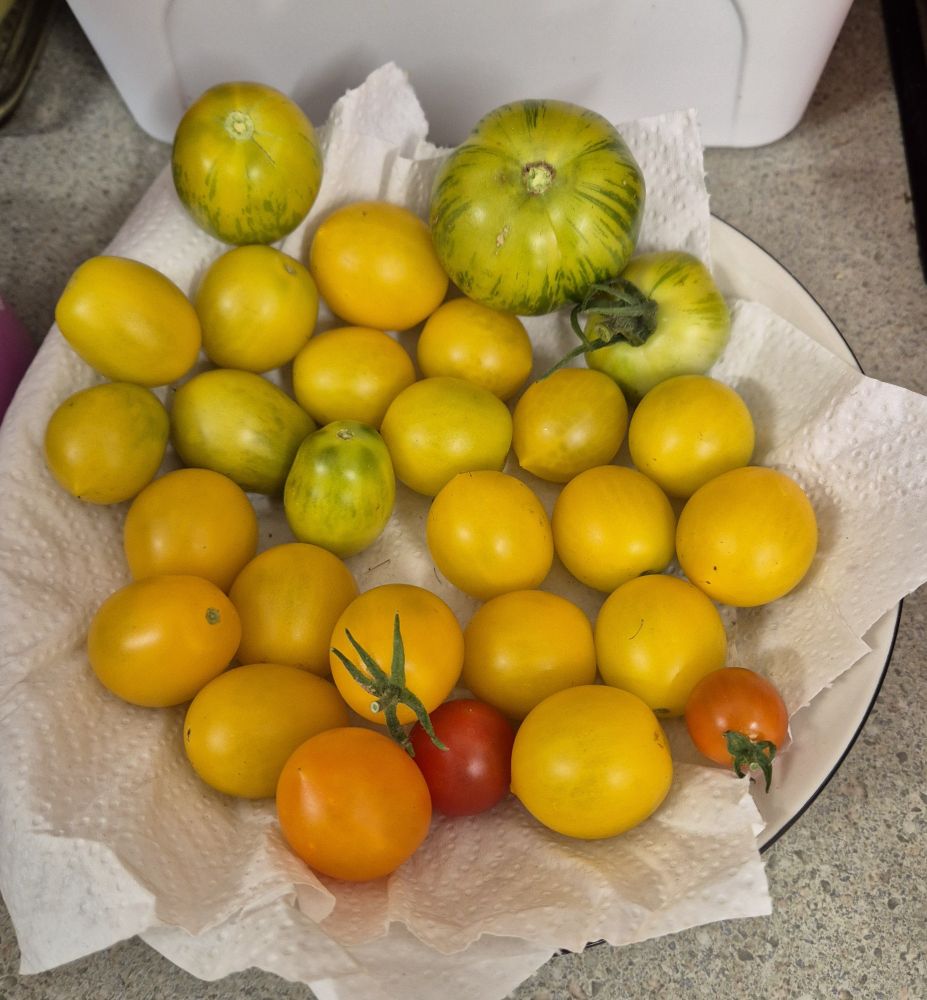 I just picked the first of my 'big' (i.e., non cherry), tomatoes, some green zebras. Hurry up and ripen! Meanwhile, tomato basil and parmesan omlette for breakfast?
