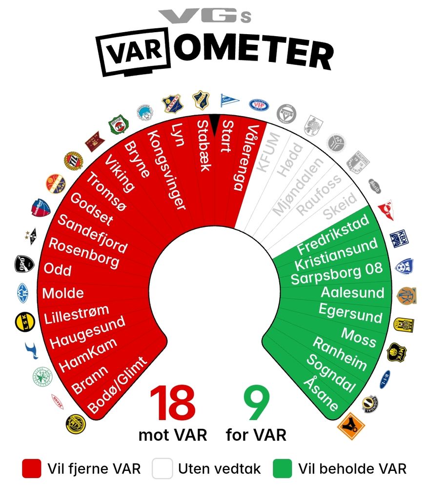 6 av klubbene som er for VAR, spiller i OBOS som ikke har VAR.