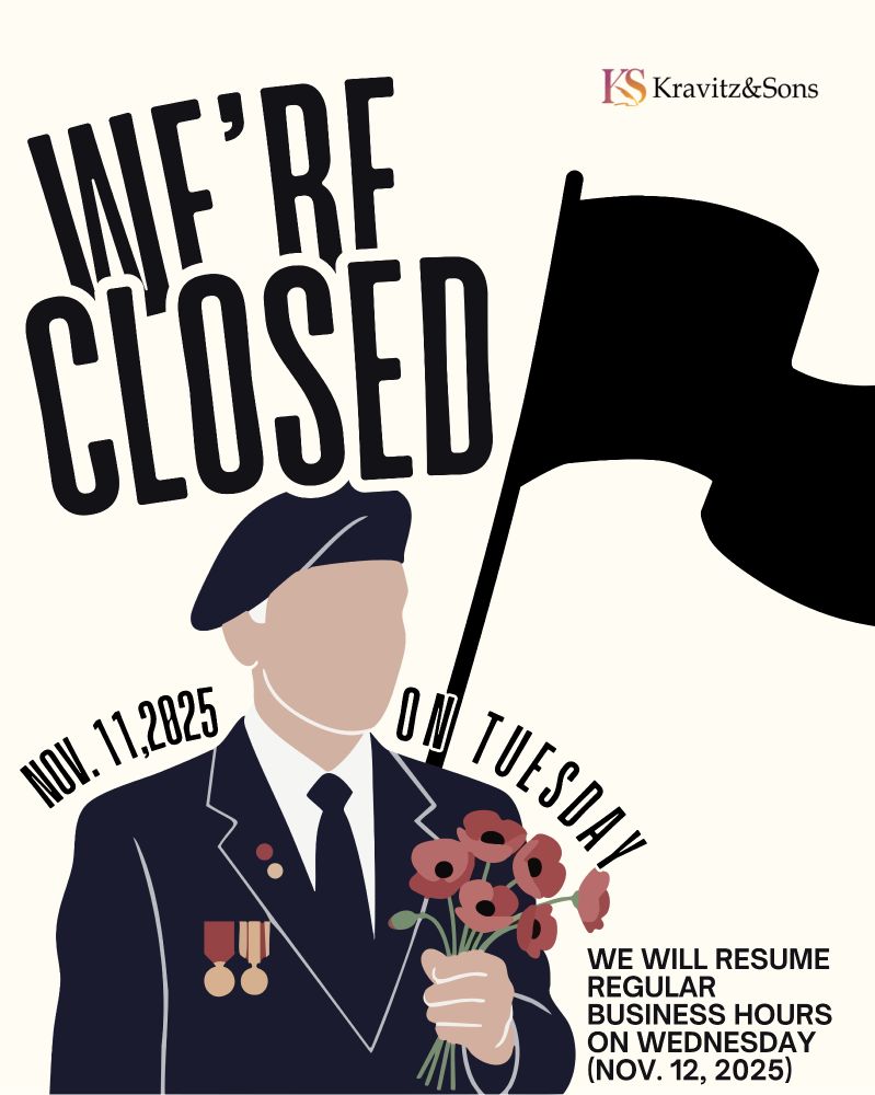 Kravitz & Sons LLC will be closed tomorrow, Tuesday, November 11, 2025, as we honor and remember the brave men and women who served our country.