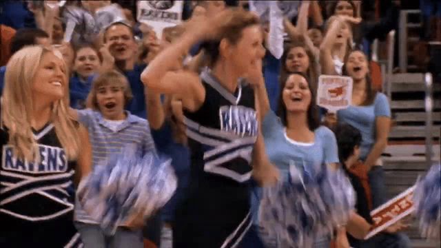 ALT: cheerleaders wearing ravens uniforms are cheering in the stands