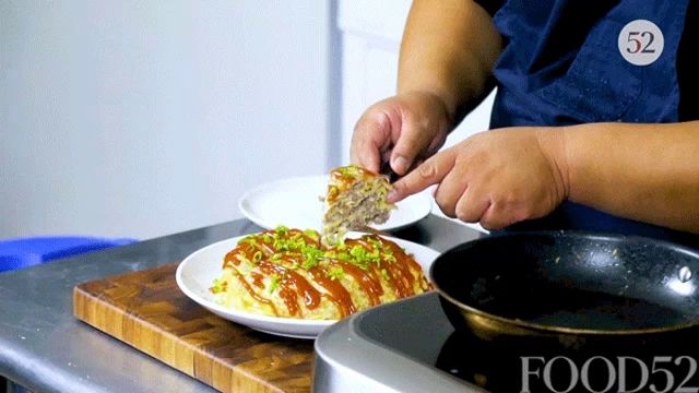 ALT: a person is preparing food and the number 52 is on their apron