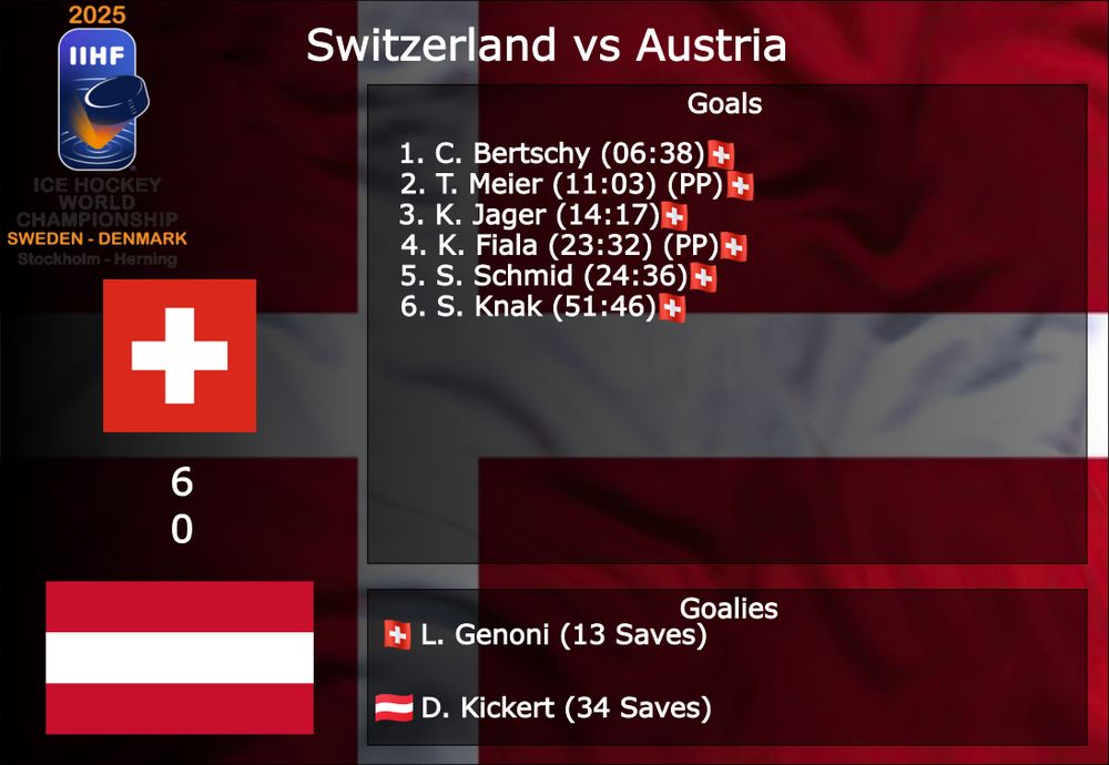 🏒Switzerland beats Austria 6-0. Christoph Bertschy (Former Wild), Timo Meier (New Jersey Devils), Ken Jäger, Kevin Fiala (Los Angeles Kings), Sandro Schmid, and Simon Knak (Former Predators Prospect) get a goal.