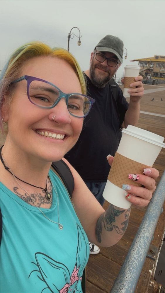Just a sleep deprived trash panda and her big brother drinking putrid coffee on the Santa Monica Pier.