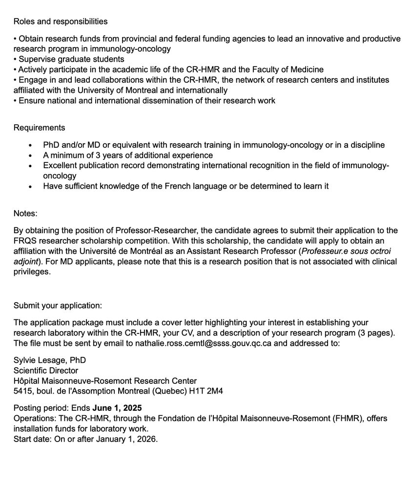 Our institute (affiliated with @umontreal.ca) is hiring! Come be our colleague and start your independent research career in the wonderful, science-friendly city of Montreal. See images for more details. You can find info about CR-HMR via this link: crhmr.ciusss-estmtl.gouv.qc.ca/en/about-cr-...