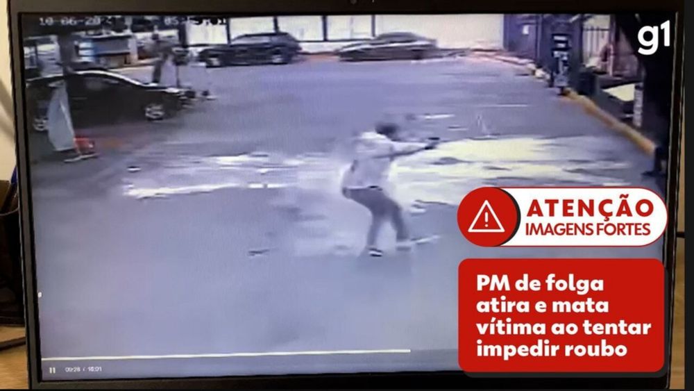 Um casal para no posto e são vítimas de assaltantes que roubam sua moto. Um PM de folga vê a cena, mata vítima do assalto e fere o namorado dela.