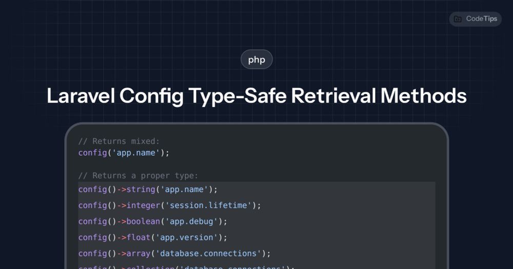 Laravel's config helper provides type-safe methods that ensure configuration values are returned in the correct format.