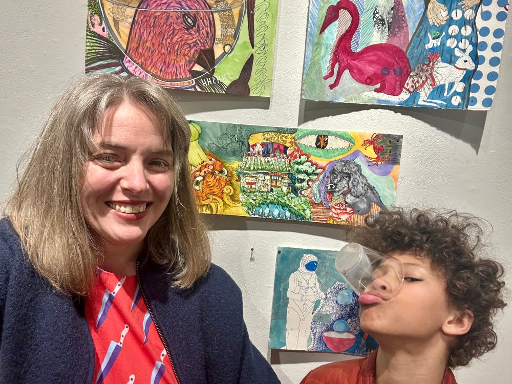 With my kiddo at our faculty art show. I put up some collaborative drawings I had made over the years one of which is with my two kiddos.