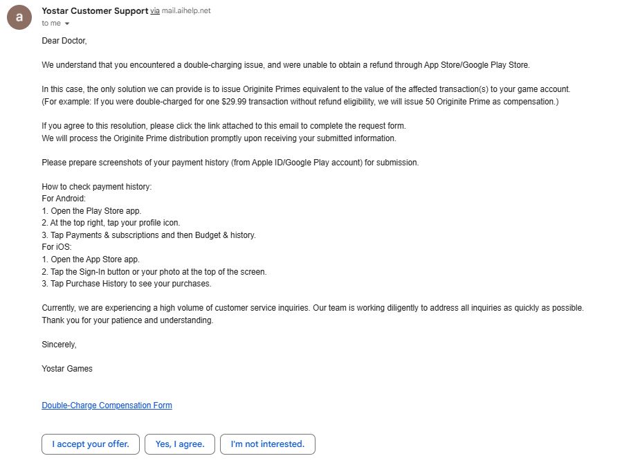 This was how I found out I got overcharged. So I sent Yostar - Hypergryph CS team for help. Google Play wouldn't accept my refund (cuz this purchase doesn't meet with our policy)