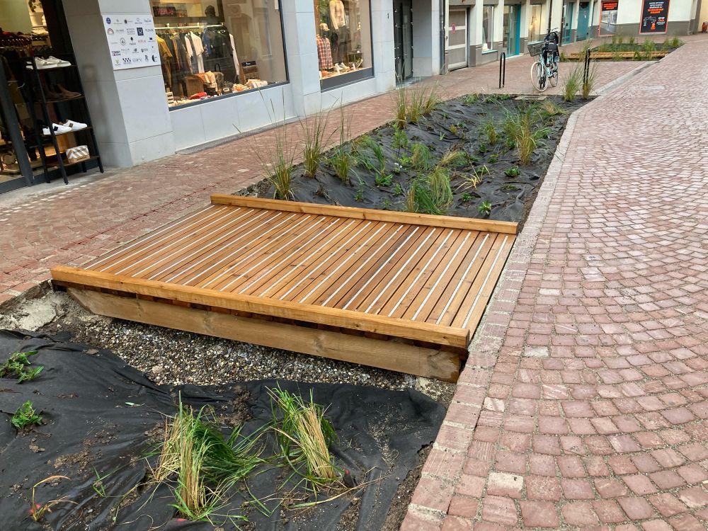 Schwammstadt: Hier entwässert eine Fußgängerzone in mehrere Rigolen. Durch das Längsgefälle werden auch die folgenden bei ausreichend Wasser befüllt. Der Steg ist ein Hingucker und erleichtert die Erreichbarkeit des Geschäfts. Gefällt mir.