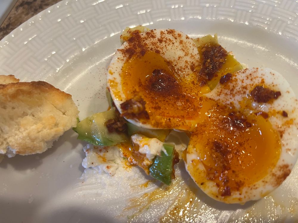 Jammy eggs over plain Greek yogurt, with smoked paprika, avocado, chili onion crunch and salt. That roll was baked this morning too. There’s coffee out of the picture, because of course there is.