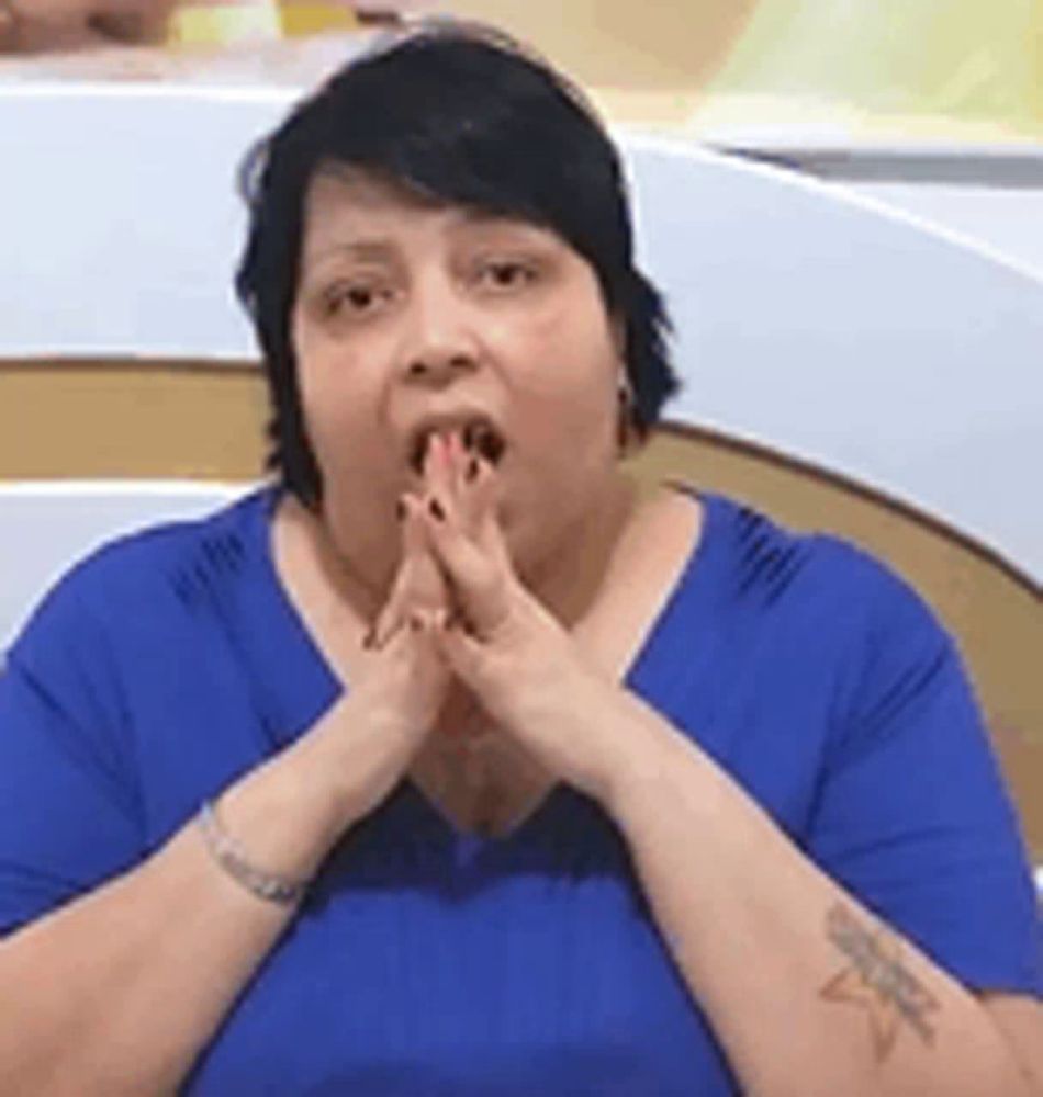 ALT: a woman in a blue shirt is covering her mouth with her hands and making a surprised face .