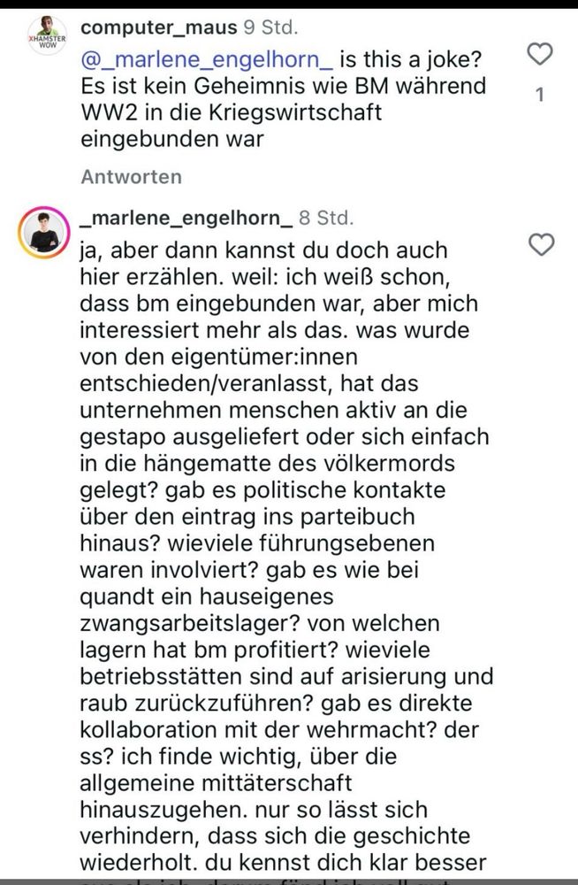 Dialog bei Instagram. Marlene #Engelhorn wird gefragt, warum sie sich nicht mit der NS-Geschichte ihrer schwerreichen Familie auseinandersetzt. Ich habe eine solche Ausrede wie ihre noch nie gehört und ich kenne viele.