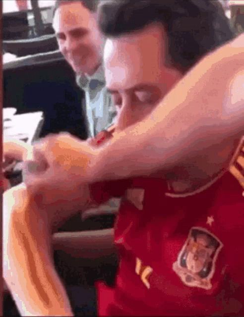 ALT: a man wearing a red jersey with the word spain on it is eating a hot dog
