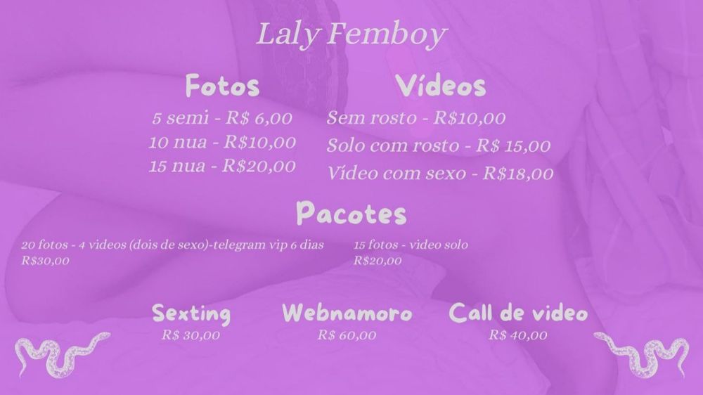 Oie me chamo Laly, tenho 19 anos. Estou com uns conteúdos novos quem quiser pode me chamar na Dm ou no Telegram: Lilafemboy Bom dia hiiihi, apenas vendas viu 😉📷 😈