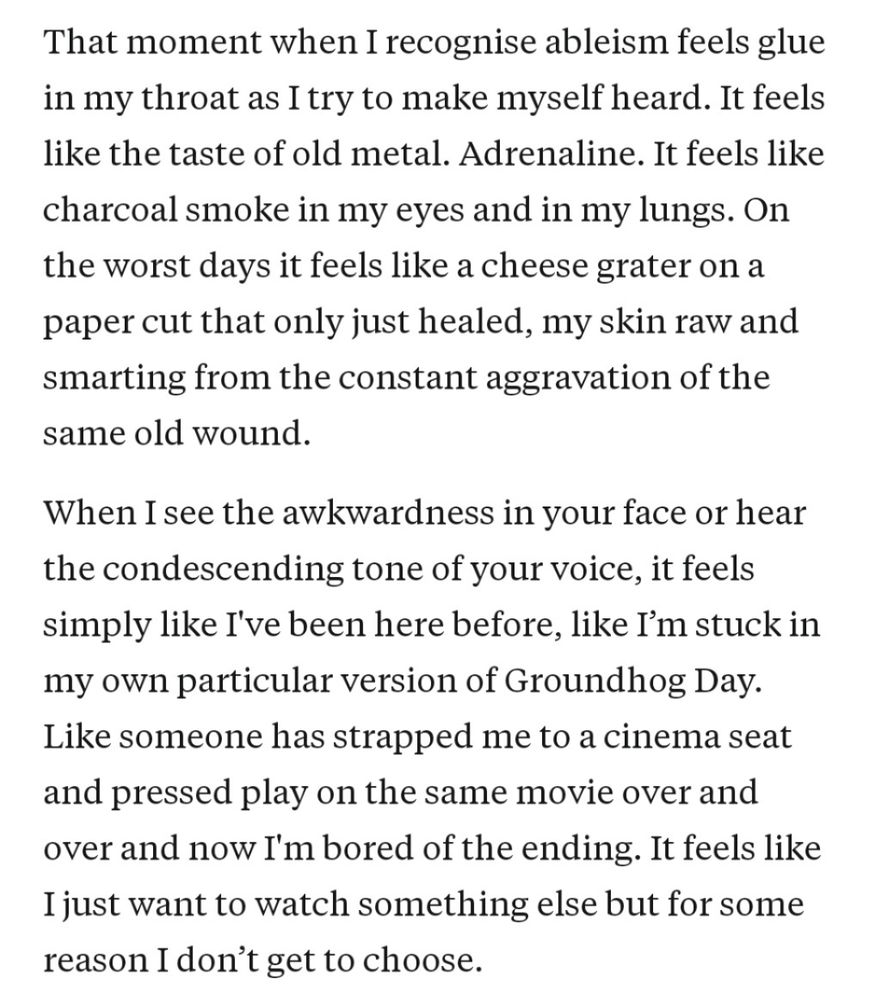 På mange måder er jeg heldig at være skånet for megen interpersonel ableisme. Det er primært den systemiske, strukturelle, jeg mødes af. Alligevel ramte fantastiske Lucy Websters ord her mig. Fordi jeg sådan genkender den knude i maven, når nogen - også potentielt i god vilje - antaster mig.