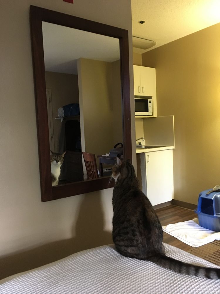 Here, the oldest of our two cats contemplates her reflection and queries the meaning of life and identity. This was in a hotel I'd had found in Spartantburg that took during and one of our hurricane evacuations (sometimes called a hurri-cation). I don't recall which hurricane…