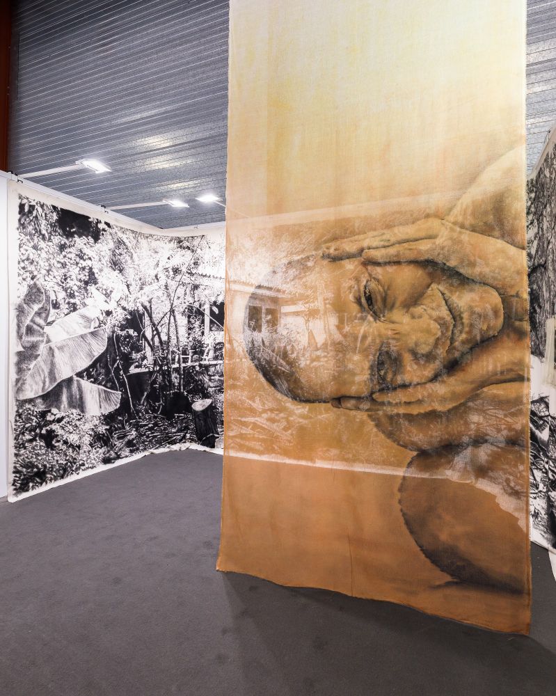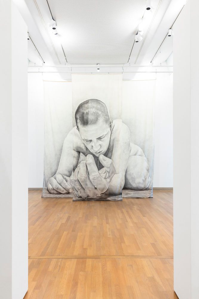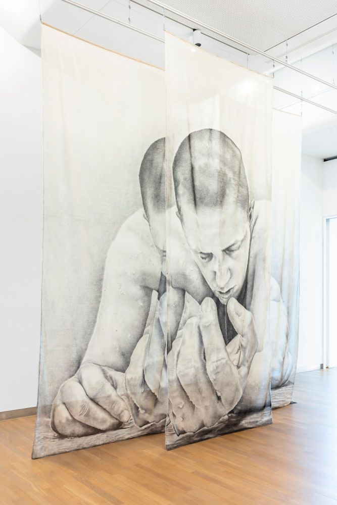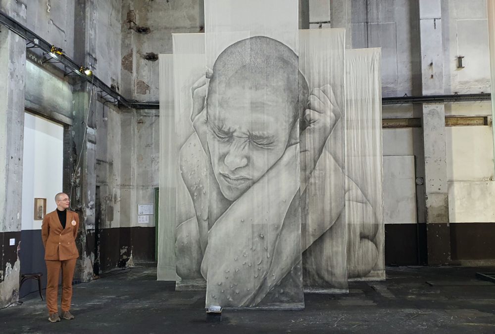 The work reflects emotions and vulnerability, captured in monumental self-portraits.