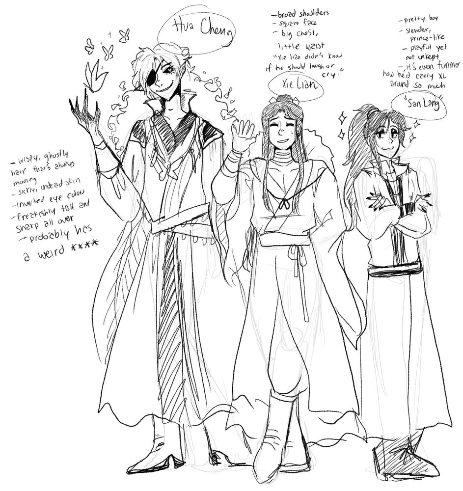 theres this one fanart i really love of "the right-hand-man" mxtx characters and i realized given my design preferences that theyd look a lot alike if i drew them together and while thats true i also saw i have a lot of ideas for them..... i especially like the things i came up for zhuzhi lang