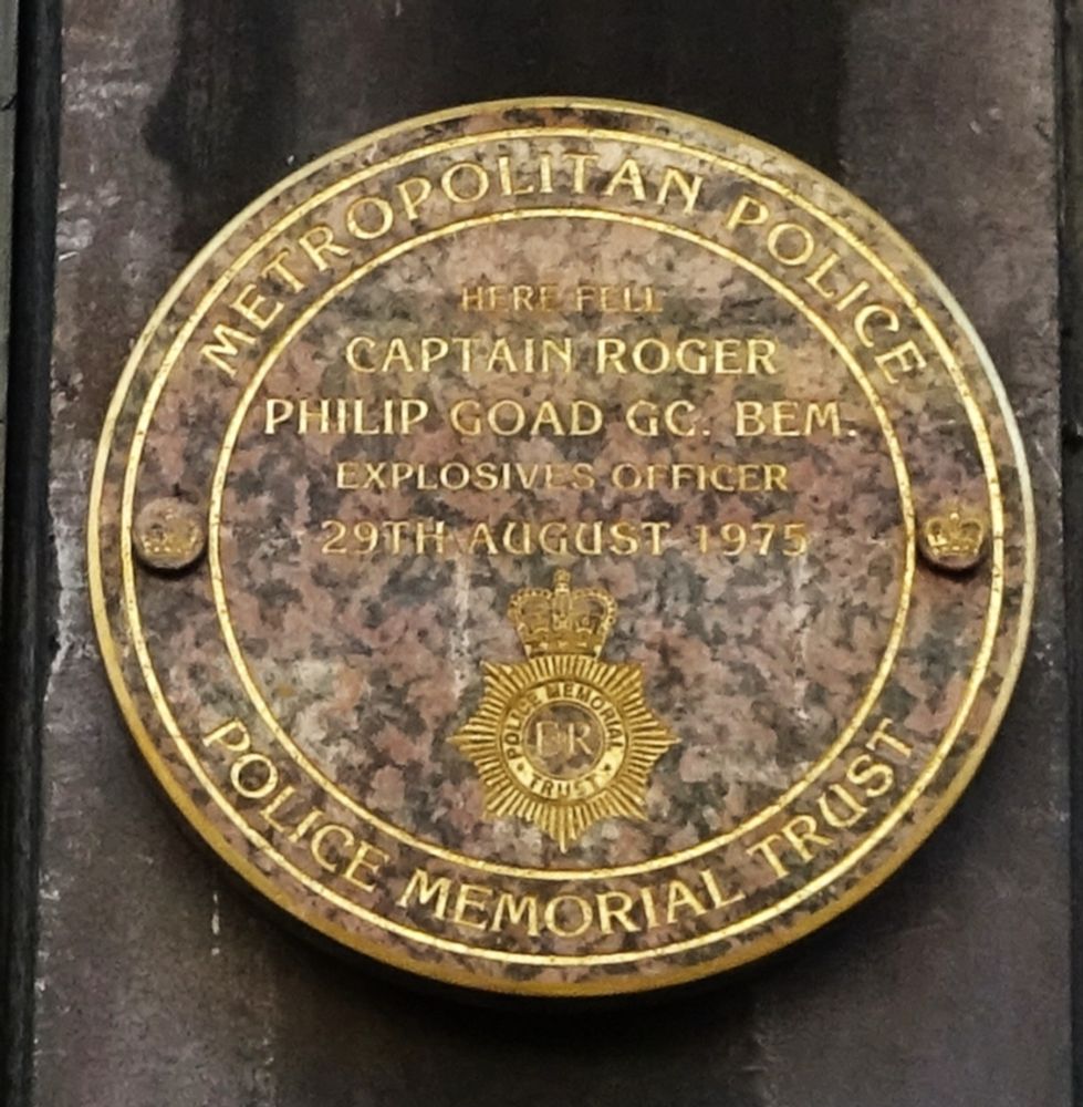 Here fell Captain Roger Philip Goad, GC, BEM, explosives officer, 29th August 1975. {Below is the badge of the Metropolitan Police.} Metropolitan Police Police Memorial Trust