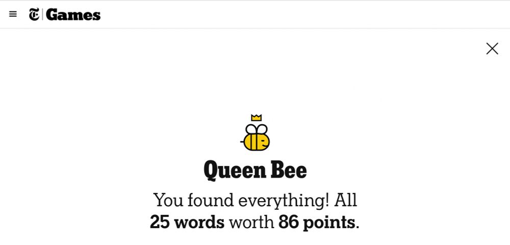 AND here’s my Queen Bee badge for today’s NYT Spelling Bee. 😎🐝🍯👑🎉🥳