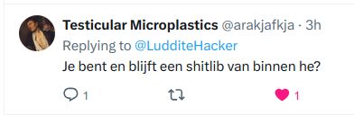 Het persoonlijkheidstype dat je moet hebben om dit soort dingen achter een slotje over iemand te tweeten komt toevallig precies overeen met het persoonlijkheidstype van de man die mijn familie aangaf bij de bezetter waardoor ze naar het kamp werden afgevoerd. De Nederlander verandert niet.
