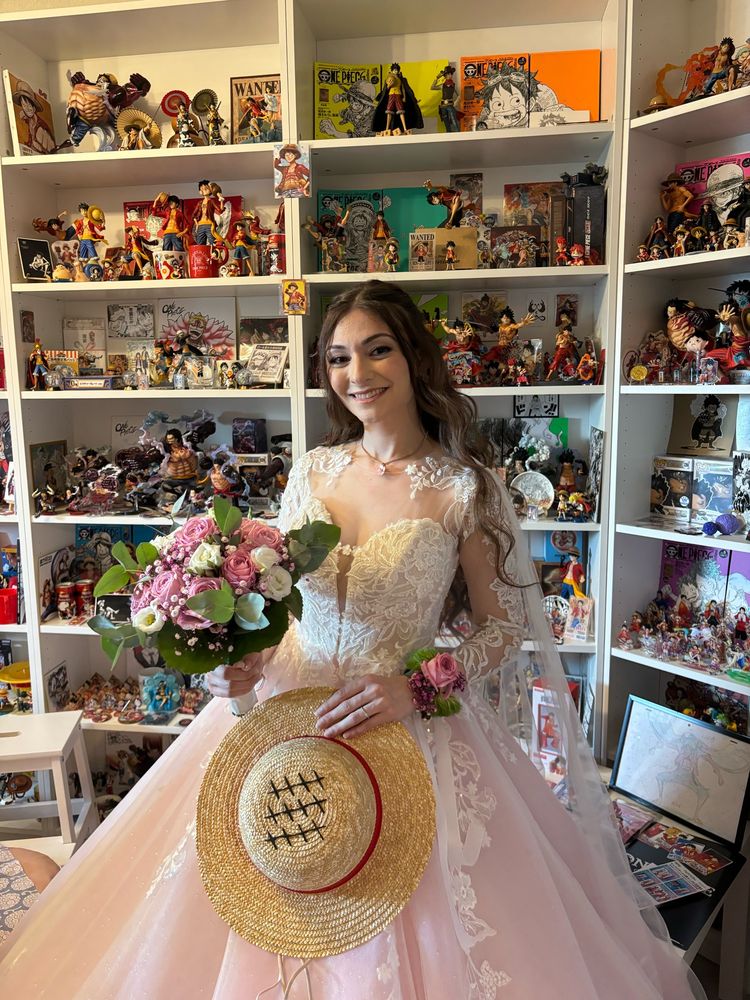 It was in my mind for a long time that I wanted a cape instead of a veil, because I’m a pirate and I wanted to include my love for Luffy and One Piece in my look!! 👒💗 I had this specifically made and it turned out incredible. 🥰