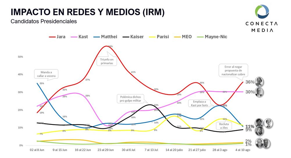 📊El Indice de Impacto en Redes y Medios (IRM) de CONECTA MEDIA muestra el pulso de la campaña presidencial. En la última semana Jara y Kast casi igualados, Matthei recupera algo y Parisi va creciendo fuerte.