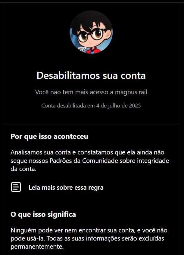 O novo sistema de inteligência artificial merda deles também afetou o instagram. Todas as minhas 3 contas lá, incluindo minha pessoal e do star rail, foram banidas de uma hora para outra. E o pior, qualquer outra conta que eu logue ou nova que crio é na hora banida.