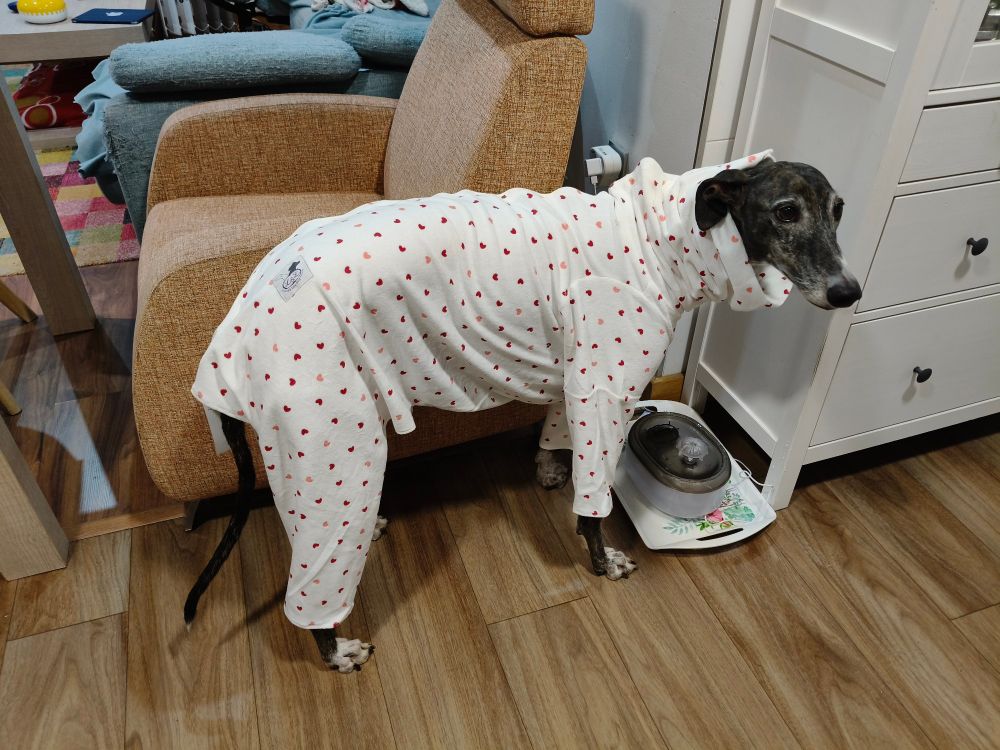 Mi galga no tiene nada de grasa y pasa frío. Por eso, le hemos comprado un pijama y ahora se la ve de esta guisa. Guapa no sé, pero graciosa fijo.
