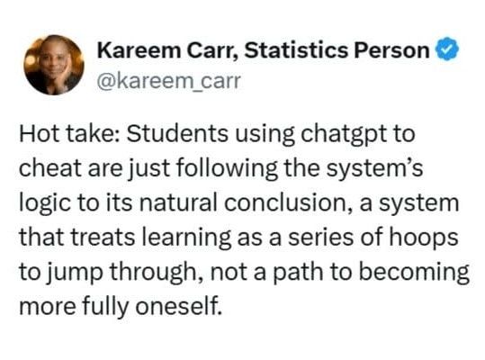 Hot take I agree with. In all my years of teaching (since 2020) at the university level, freshman and sophomore students *obsess* over getting the right answer, and will do what it takes to get there. Very few actually focus on understanding & knowing underlying principles of physics. #USeducation